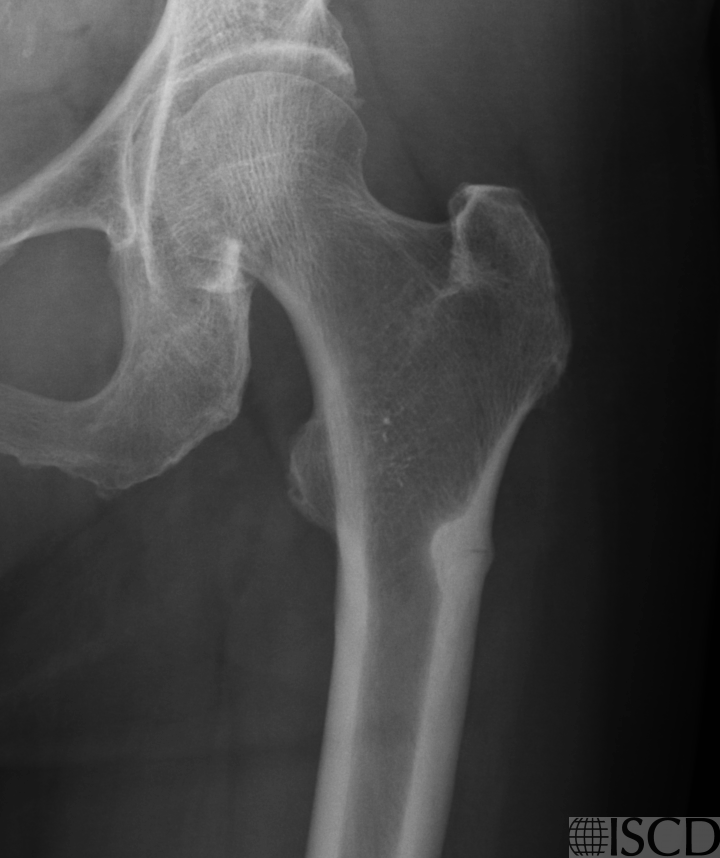 84 year old Asian female with 10 years of oral bisphosphonate therapy due to low bone mass (osteopenia) and breast cancer (aromatase inhibitor therapy). Left hip DXA image shows localized endosteal reaction lateral subtrochanteric femur, more prominent on the left side. Subsequent x-rays confirmed an incomplete left atypical femur fracture (AFF) with “dreaded black line” (no x-ray of the right hip available).