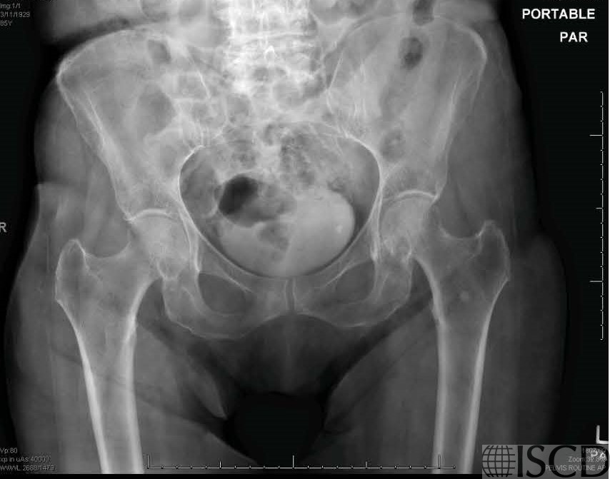 There is a bone island seen on the left Hologic proximal femur scan. On the accompanying pelvic radiograph, the sclerotic foci in the left ilium and proximal femur were read as consistent with bone islands. A bone island is also known as an enostosis and is a benign lesion. Most lesions are small and round and are composed of cortical bone within the cancellous bone.