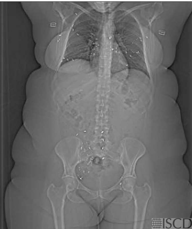 Black hole artifacts occur with dense metals such as lead and tantalum on a Hologic scan. Other metals, like stainless steel, don’t produce black hole artifacts. Presumably there is complete attenuation of both Kev peaks so the difference is zero, making the image appear black. Lead bullets are measured as having high bone mineral content (BMC) and appear black in the dual-energy mode on the Hologic scanner and blue as artifact on GE Healthcare scanners. Black hole artifacts over bone are handled differently between Hologic and General Electric. With the Hologic scanner, when a dense artifact overlies bone, the BMC associated with that artifact is excluded, but the bone area is not altered. Consequently, the bone mineral density (BMD) of the affected vertebra, and of L1-4 is decreased. The GE scanners exclude both the associated BMC and area covered by the artifact, thereby minimizing the impact on BMD. Dense artifacts in the soft tissue do not significantly affect BMD on either manufacturer’s densitometer on phantom experiments., however, further experiments need to be done to verify this finding.