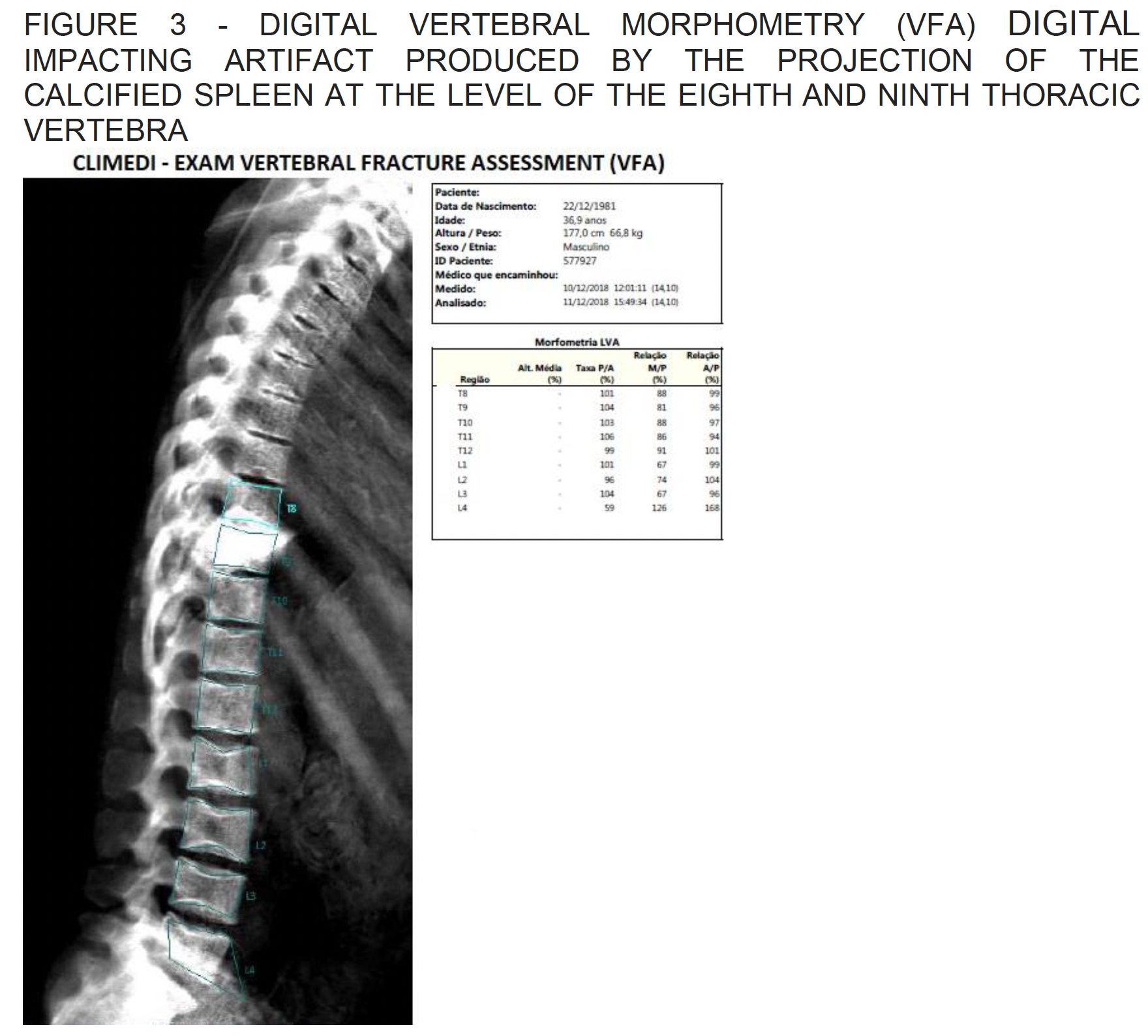 Digital Vertebral morphometry – impacting artifact produced by the projection of the calcified spleen at the level of the eighth and ninth thoracic vertebra.