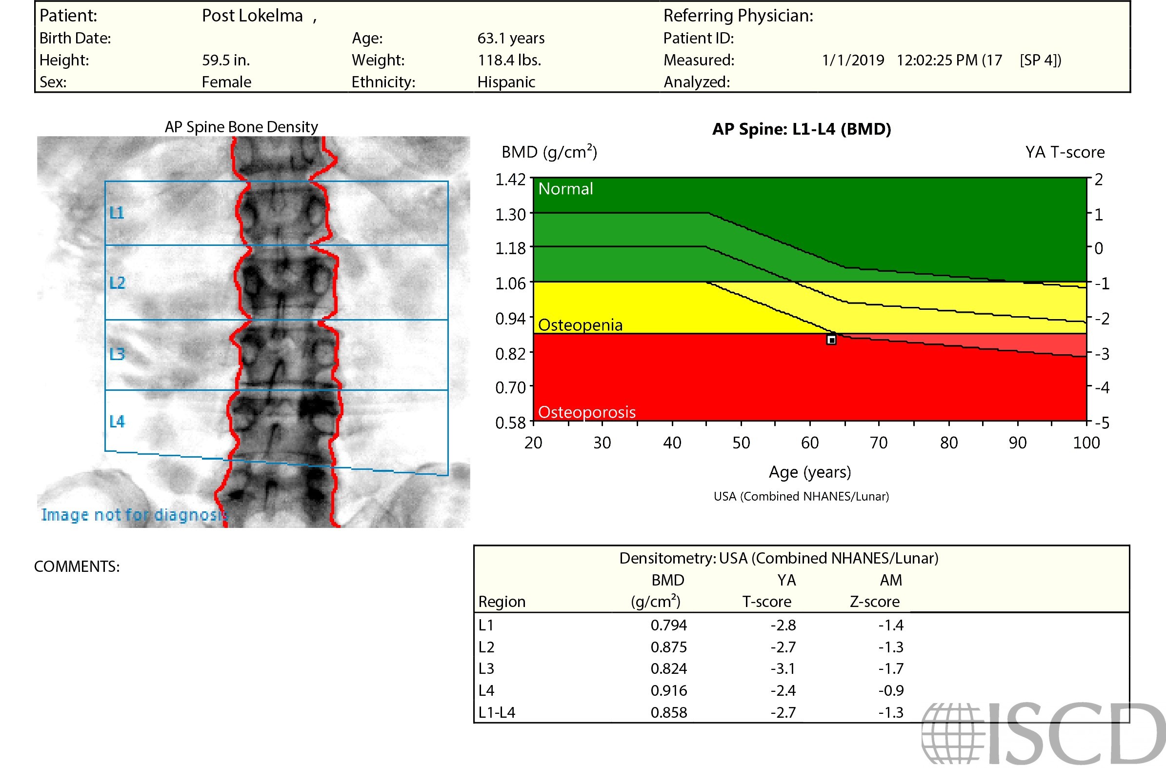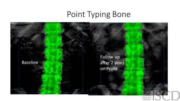 This is a patient with a baseline and follow-up scan after 2 years of Prolia. There was a visual difference between the scans, with increased and diffuse gray color on the followup spine scan. The total femur was stable at 0.639 g/sq cm at baseline and 0.631 g/sq cm at follow-up. History and further patient interview revealed that Lokelma was started between scans. Lokelma is sodium zirconium cyclosilicate and is used to treat hyperkalemia. It attracts potassium for excretion to prevent absorption. The Lokelma would affect the soft tissue baseline and thereby affect measured bone mineral density. A medication history can be very useful in evaluation of DXA scans and it is important to evaluate the images for differences between scans..