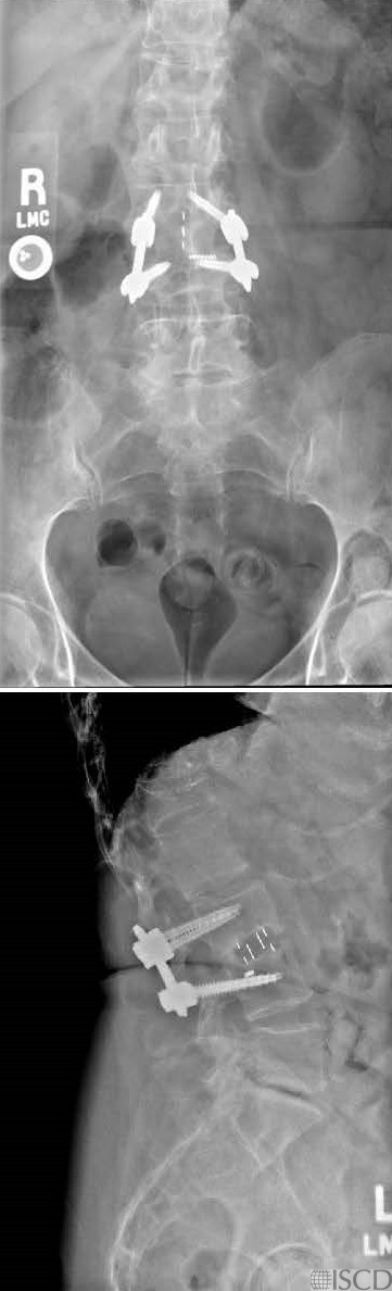 The accompanying radiograph shows the spinal fixation hardware and the intervertebral disc spacer and a L1 compression fracture.
