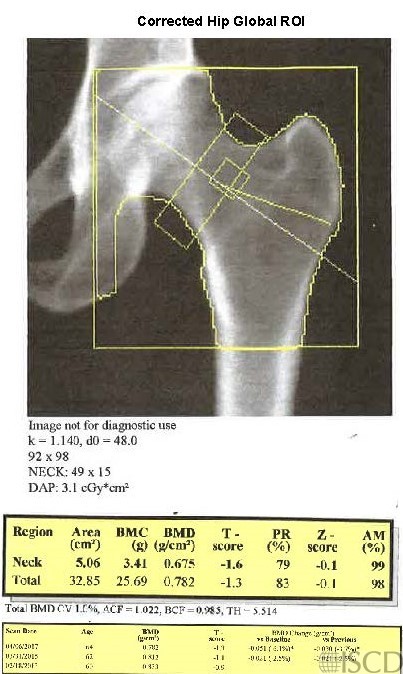 In this panel the global hip region of interest is now the same as baseline. The total hip bone mineral density is now less because less cortical bone from the femoral shaft is included in the total hip region of interest. Note that the sizes of the hip global region of interest, in pixels, are the same on the baseline and follow-up scan.