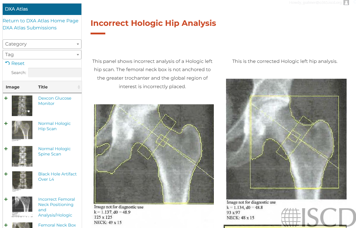 The ISCD DXA Atlas is written to show principles of quality DXA scanning, artifacts, issues with analysis, reporting and interpretation as well as serve as an archive of interesting DXA cases. The ISCD DXA Atlas is accessible to ISCD Members as a benefit included in their membership dues.